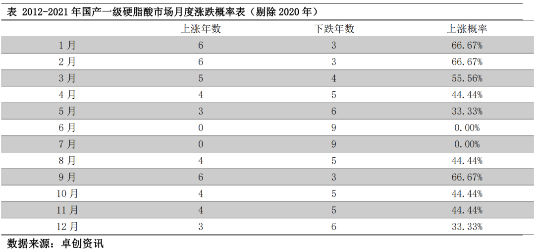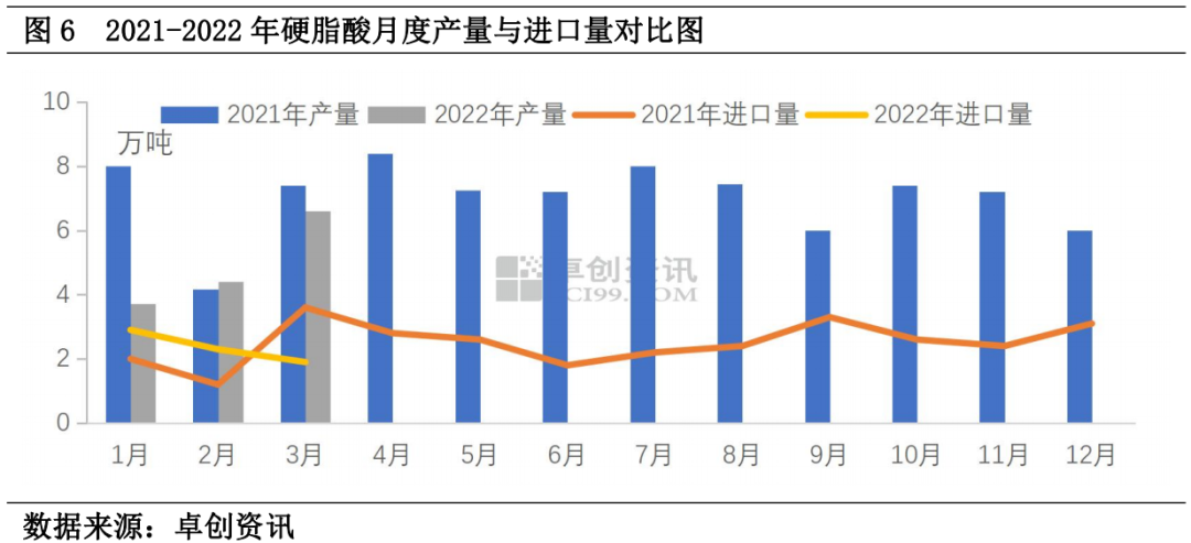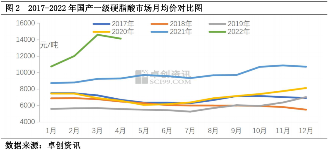 在這種漲勢下,一季度硬脂酸市場價格明顯高于往年同期水平。1月份國產(chǎn)一級硬脂酸市場月均價同比漲23.05%,2月同比漲36.55%,3月同比漲58.09%。